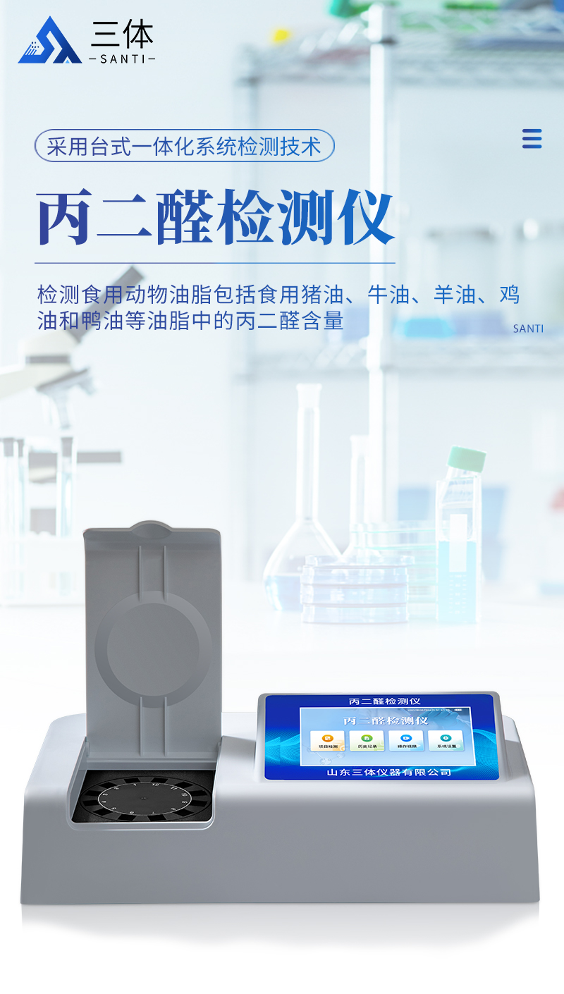 山東三體儀器有限公司生產(chǎn)的丙二醛檢測儀為集成化食品安全快速檢測分析設(shè)備,采用臺式一體化設(shè)計,能夠快速檢測食用動物油脂包括食用豬油、牛油、羊油、雞油和鴨油等油脂中的丙二醛含量;儀器預(yù)留其他項目檢測程序和端口,根據(jù)日后需求可進(jìn)行遠(yuǎn)程升級
